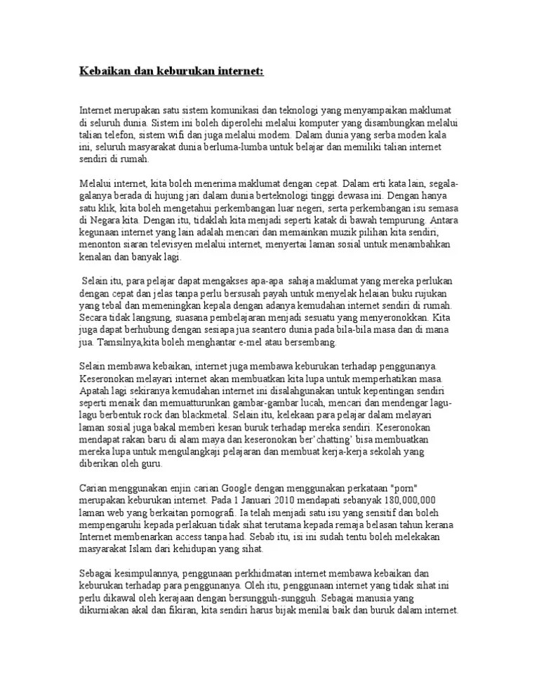 Kebaikan dan keburukan internet kepada pelajar. Cadangan untuk mengurangkan kesan negatif internet kepada pelajar. Pada era globalisasi ini, internet sangat penting dalam kehidupan masyarakat.